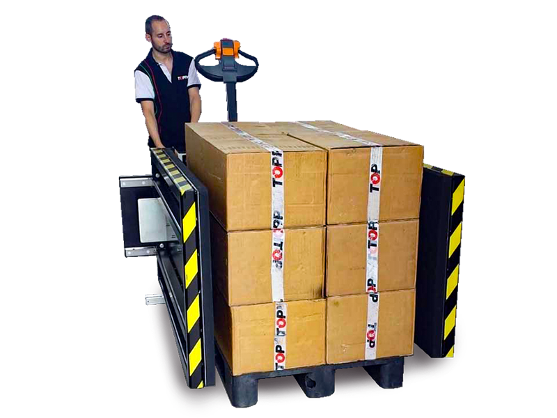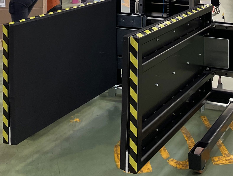 The side platforms are fitted with padded clamps to protect the product from any damage during lateral pressure. The pressure can be adjusted using a pressure gauge on the machine to accommodate the load’s specific characteristics.