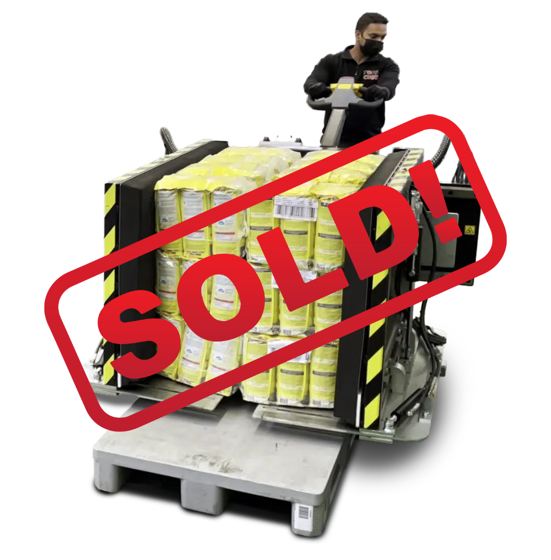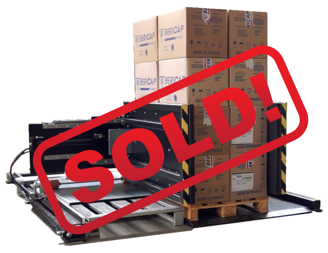Stationary model that safely transfers products from one pallet to another.