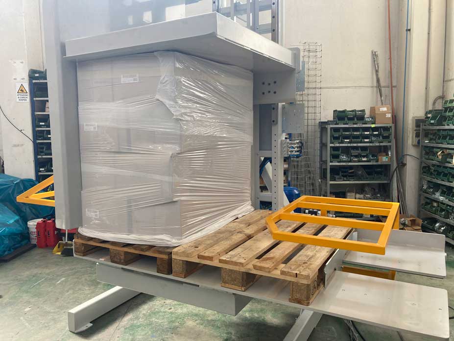 Depending on whether it’s the manual or automatic version, the operation varies. In manual mode, the operator controls the opening and closing of the upper platform, as well as the rotation of the machine, and the sliding of the pallets. Alternatively, in automatic mode, the process is entirely automatic—simply load the product and the destination pallet into the machine, press the start-button on the control panel, and the machine will execute the pallet exchange operation autonomously.